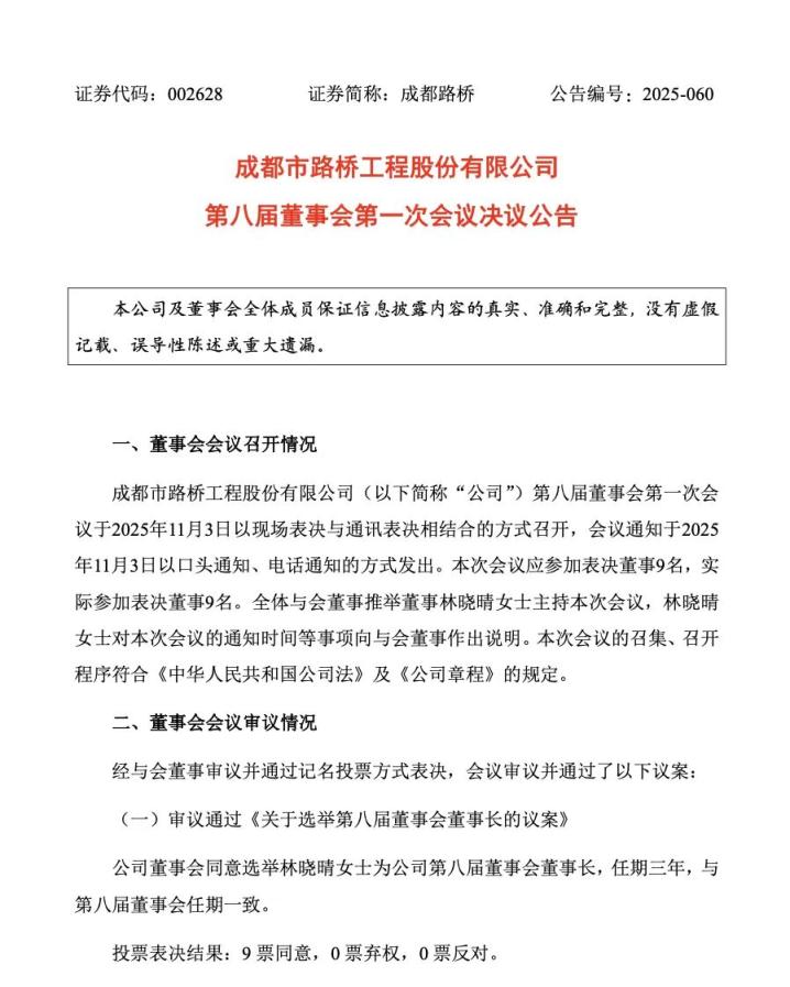 11月4日,成都市路桥工程股份有限公司(以下简称“成都路桥” )发布公告表示,公司董事会同意选举林晓晴为公司第八届董事会董事长,任期三年,与第八届董事会任期一致。